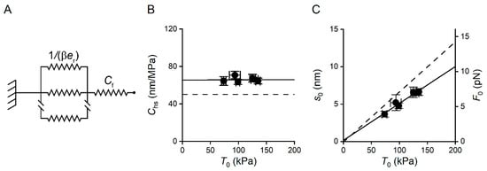 Chs was constant in the whole range of the temperature-modulated T0 (Figure 4B). Therefore, given that the contribution of myofilament compliance is constant independent of temperature, the array of motors also contributes to Chs with a compliance that is constant independent of the value of the temperature-modulated T0. This, in turn, indicates that the fraction of attached motors, β, does not change significantly with temperature. Here, 1/(β·er) corresponds to s0/T0, where s0 is the average strain shared by the attached motors (as they are in parallel) contributing to the ensemble force T0. Thus, Chs can also be expressed as follows: