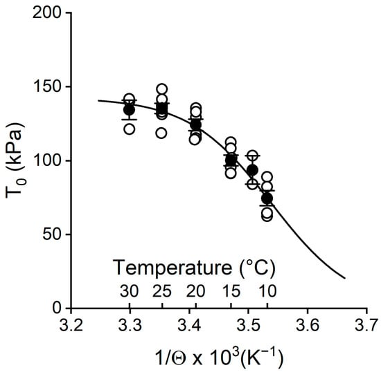 Relation between steady isometric force developed at pCa 4.5 and the reciprocal of absolute temperature Θ. Circles are mean ± SEM from Figure 1A. The line is the fit to the pooled data using (4).