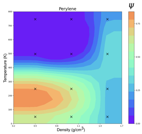 The ordering ( Ψ ) of perylene modeled with ESP-UA as a function of temperature and density is summarized in Figure 3. Consistent with Ref. [20], the most ordered structure (T = 250 K and ρ = 0.5 g/cm3) exhibited significant π -stacking, which is visible in Figure 4. At lower temperatures, we observed a transition from highly ordered to less ordered as the density increased, which is also in agreement with prior work. This is due to the steric hindrance of having a high number of molecules in a restricted volume, as has also been observed in prior work.