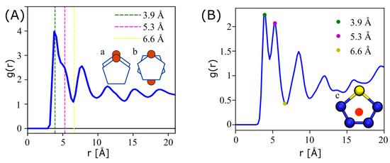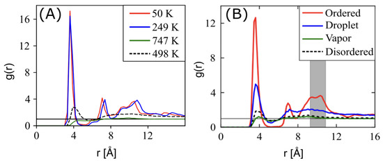 Comparing the RDFs reported in Ref. [19] at a density of 1.7 g/cm3 against the present work shows good agreement in short-range ordering as a function of temperature. At the highest temperatures (i.e., 747 K, and shown in green in Figure 5A) we observed near-ideal gas behavior as in the vapor phase of Figure 5B, though the slightly lower first-correlation peak at 4.0 Å indicates ESP-UA has lower short-range attractions, as expected by the differences in ϵ . Disordered structures at moderate temperatures (498 K in Figure 5) have the same peak locations as in prior work, but slightly higher intensities (e.g., g ( 4 ) = 3.8 vs. g ( 4 ) = 1.8 ). As temperature was lowered further, we saw close agreement between the ordered (shown as red 50 K in Figure 5), but we also saw more ordering at 249 K (shown as blue in Figure 5) than in the droplet phases observed in prior work. Taking a closer look at the ordered (red) phases, we observed consistency across the first four local maxima locations, with slightly higher intensities in the present work and with a lower 3rd–4th peak ratio than in prior work, indicating subtle packing differences. Thus, the trend from disordered vapor phases to condensed, crystalline packings was consistent between the two forcefields, though the specific temperatures at which the transitions occurred varied due to the relative differences in ESP-UA and OPLS-UA energy scales.