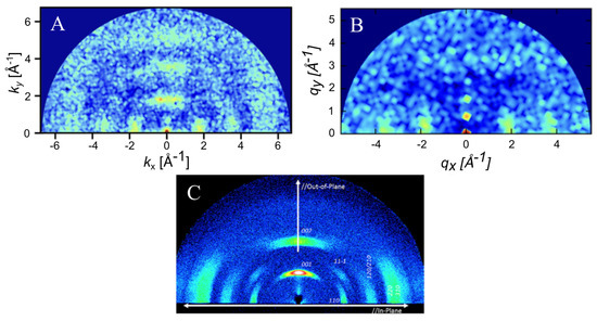 Figure 6. (A) The grazing incident X-ray scattering pattern of perylene generated from an ESP-UA morphology. (B) The GIXS pattern of the perylene generated from an OPLS-UA morphology. The OPLS-UA GIXS pattern published by Miller et. al. in Ref. [19]. (C) The experimental XRD pattern for β −perylene, which was reproduced with permission from Ishii et al. from Ref. [26]. Copyright 2014 AIP Publishing LLC. (Melville, NY, USA).