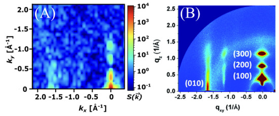 Figure 9. (A) The grazing incident X-ray scattering pattern of P3HT at 0.5 g/cm3 and 304 K generated using ESP-UA. (B) The corresponding experimental scattering pattern of P3HT. Reprinted (adapted) with permission from Ko et al., as shown in Ref. [28]. Copyright 2012 American Chemical Society.