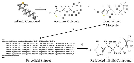 Molecular simulations offer promise for the high-throughput screening of thermodynamically stable structures from families of molecules. Such screening studies can identify chemistries and conditions where the self-assembly of desired structures are optimized, and they can provide insight into identifying chemistry–structure—property relationships that are otherwise inaccessible with experimental methods [1,2,3,4,5,6]. One challenge of screening studies, particularly of polymers, is that the parameters that define the interactions between and within model molecules may not have been defined for a given “off-the-shelf” forcefield [7]. In molecular mechanics simulations, forcefields define the potential energies and therefore forces of bond, angle, torsion/dihedral, and non-bonded models of interatomic interactions [8,9]. For example, the popular Optimized Potentials for Liquid Simulations (OPLSs) forcefield has mainly been built around simulating hydrocarbons and proteins [10,11]. The General Amber Forcefield (GAFF) is optimized for small organic molecules [12].