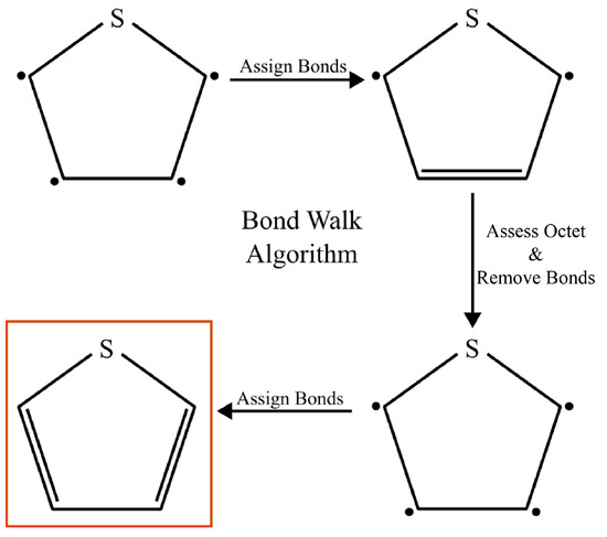 Figure 13. The double- and triple-bond information that is missing from the mBuild compounds is retrieved via BondWalker by iteratively checking whether the octet rules can be satisfied for all atoms after incrementing the bond character adjacent to atoms with unsatisfied octets. Highlighted ring in the lower left shows correct double-bond assignment after application of Bondwalker.