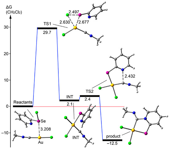 The mechanism of the new coupling reaction between 2-pyridylselenyl chloride and Au(I) isocyanide complexes formally involves two key steps: the oxidative addition of the Se–Cl moiety to Au(I) and the nucleophilic addition of the pyridine fragment to the isonitrile’s CN triple bond. These steps may occur either sequentially or simultaneously. To elucidate the mechanism, we performed additional DFT calculations, which ruled out the simultaneous mechanism. For computational efficiency, we simplified the isocyanide complex to CH3-N≡C–Au–Cl. We explored the potential energy surface connecting the [(Me2S)AuCl] and CH3-N≡C–Au–Cl reactants to the final adduct using the NEB-TS (Nudged Elastic Band with TS optimization) method, which locates the transition state (TS) by using the geometries of the reactants and products. The NEB-TS analysis identified an intermediate corresponding to the oxidative addition of the Se–Cl moiety to Au(I) (Figure 3). Starting from this intermediate, we computed two transition states, linking it to both the reactants and the product. The ΔG values in CH2Cl2 reveal that the oxidative addition is the rate-determining step, with a barrier of 29.7 kcal/mol. Interestingly, the reactants form a supramolecular complex prior to the oxidative addition, where the Se atom is preorganized 3.028 Å from the Au atom. The second step, the nucleophilic addition of the pyridine fragment to the CN bond, occurs with a minimal barrier of 0.3 kcal/mol, leading to the final product, which is 12.5 kcal/mol more stable than the starting material.