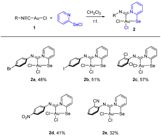 For this study, we used Au(I) isocyanide complexes, which were obtained in situ by reacting the corresponding isocyanides with [(Me2S)AuCl] in dichloromethane. The addition of 2-pyridylselenyl chloride to solutions of Au(I) isocyanide complexes in CH2Cl2 resulted in a gradual formation of orange precipitates (Scheme 2). The isolation and analysis of the solids suggested the formation of the adducts of 2-pyridylselenyl chloride with isocyanide-gold(I) chloride in 32–57% yields (Scheme 2).
