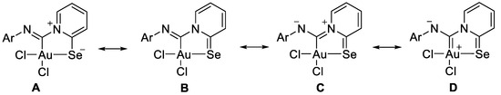 The bond distances in the ligand demonstrate that the main mesomeric form for 2-pyridine-selenyl carbene complexes is mesomeric form A with single C–Se and double N=C(carbenoid) bonds. The length of the C–NPh bond is affected by electronic effects from substituents at different positions in the phenyl ring. The ligand chelates the gold(III) atom with the formation of a rigid five-membered cycle; however, the angle between the pyridine ring and the mean plane formed by the AuCl2 fragment varies from 20.1(2) to 36.50(13). The angle between an aryl ring and the pyridine cycle is equal to 15.3(3)–60.4(10) due to rotation around a single N–C bond.