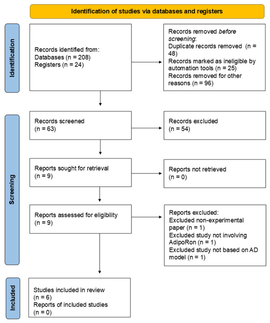 Figure 2 illustrates the Preferred Reporting Items for Systematic Reviews and Meta-Analyses (PRISMA) [97] flow diagram for the review process. The database search was conducted between 1 July 2024 and 1 November 2024. The search process yielded 208 records from databases and 24 records from registers. Following this initial identification, duplicate records were systematically removed, totaling 48. Additionally, 25 records were flagged as ineligible by automated tools (Rayyan automated tool, https://www.rayyan.ai/, accessed on 31 October 2024), and a further 96 records were excluded for various reasons deemed appropriate (54 due to publication type, 24 for language restrictions, and 18 for inappropriate study design). After these exclusions, 63 records remained for manual screening. This process resulted in the exclusion of 54 records that needed to meet the criteria for further review. Subsequently, nine reports were requested for retrieval to gather more detailed information. Fortunately, all nine reports were successfully retrieved. Each of the nine successfully obtained reports was carefully assessed for eligibility. This assessment led to the exclusion of three reports for the following reasons: one was a non-experimental paper, one did not involve AdipoRon, and one was not based on an AD model. In the end, six studies were deemed eligible and included in the review. However, no additional reports related to the studies included were available.