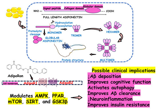 Adiponectin synthesis and effects of AdipoRon against Alzheimer’s Disease. Adiponectin from adipose tissue presents several neuroprotective mechanisms that influence the activity of Adiponectin Receptor 1 (AdipoR1) and Adiponectin Receptor 2 (AdipoR2) receptors in the central nervous system. Since AdipoRon is an adiponectin receptor agonist, this molecule is expected to show the same neuroprotective effects. The evidence suggests that while modulating AdipoR1 and AdipoR2, AdipoRon affects Adenosine Monophosphate-Activated Protein Kinase (AMPK), Peroxisome Proliferator-Activated Receptor (PPAR), Mammalian Target of Rapamycin (mTOR), Sirtuin (SIRT), and Glycogen Synthase Kinase 3 Beta (GSK3β) signaling pathways. By acting on these signaling pathways, AdipoRon can exert many beneficial effects against Alzheimer’s disease, improving Amyloid-Beta (Aβ) deposition and clearance, enhancing cognitive function and brain insulin resistance, and activating autophagy.