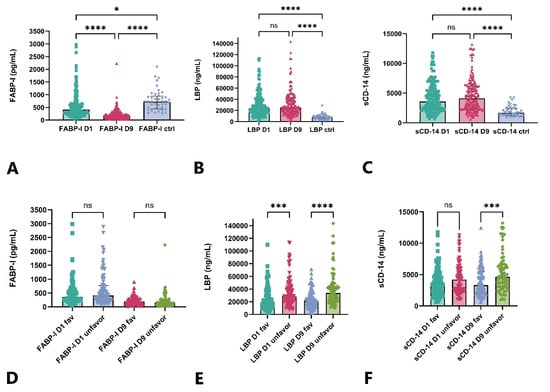 Serum level of FABP-I, LBP and sCD-14 in aSAH patients versus controls (A–C) and in different outcome groups (D–F). FABP-I, fatty acid-binding protein-intestinal, LBP, lipopolysaccharide-binding protein, D1, sampling time 24 h after ictus, D9, sampling time 9 days after ictus, fav, favorable (modified Rankin score 0–3) outcome, unfavor, unfavorable (modified Rankin score 4–6) outcome, ns, non-significant, * denotes p < 0.05, *** denotes p < 0.001, **** denotes p < 0.0001, number of control subjects: 100, number of patients with favorable outcome: 94, number of patients with unfavorable outcome: 83.
