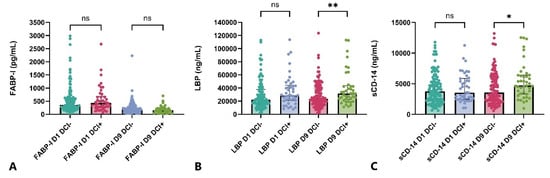 In the analysis of FABP-I levels, no differences were observed in the serum levels of either the early or late samples between the two outcome groups (Figure 1D). In the group with unfavorable outcomes, significantly higher LBP serum levels were observed compared to the favorable outcome group at both measurement time points (D1, D9) (Figure 1E). A significant difference in serum sCD-14 levels between the two outcome groups was observed only at the D9 sampling time point, while no difference was detected in the early sample taken 24 h after the ictus (Figure 1F). None of the three examined metabolites showed any correlation in the early phase (D1) of aSAH with the occurrence of delayed cerebral ischemia. In contrast, both LBP and sCD-14 reached significantly higher serum levels in the DCI subgroup in the later phase (D9) (Figure 2).