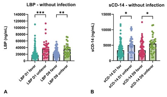 We also examined the serum levels of LBP in the context of hospital-acquired infections and found that in patients who did not develop an infection (n = 116) during hospitalization (median [IQR] serum level of CRP during hospitalization: 5.7 [2–12]), LBP reached significantly higher levels in the unfavorable outcome group compared to those with favorable outcomes at both measurement time points (Figure 3A). We found a similar but weaker correlation in the case of sCD-14 as well (Figure 3B). In patients who developed an infection (n = 61) during hospitalization (median [IQR] serum level of CRP during hospitalization: 73.4 [53–112]), we did not observe any difference in serum levels of LBP or sCD-14 between the favorable and unfavorable outcome groups at any measurement time point. In the group without infection (n = 116), we performed a correlation analysis between serum CRP levels and early (D1) and late (D9) LBP and sCD-14 values. We did not observe a significant correlation for any marker in either the early or late phase.
