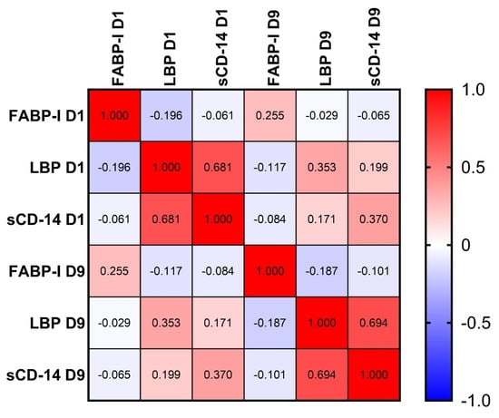 Heat map showing correlation matrix of FABP-I, LBP and sCD-14. In heatmap, red indicates positive, while blue indicates negative correlation. The darker the color, the stronger the correlation. The Spearman rank correlation test was used. A p-value < 0.05 was accepted as significant. p > 0.10 are presented in white squares. FABP-I, fatty acid-binding protein-intestinal, LBP, lipopolysaccharide-binding protein, D1, sampling time 24 h after ictus, D9, sampling time 9 days after ictus.