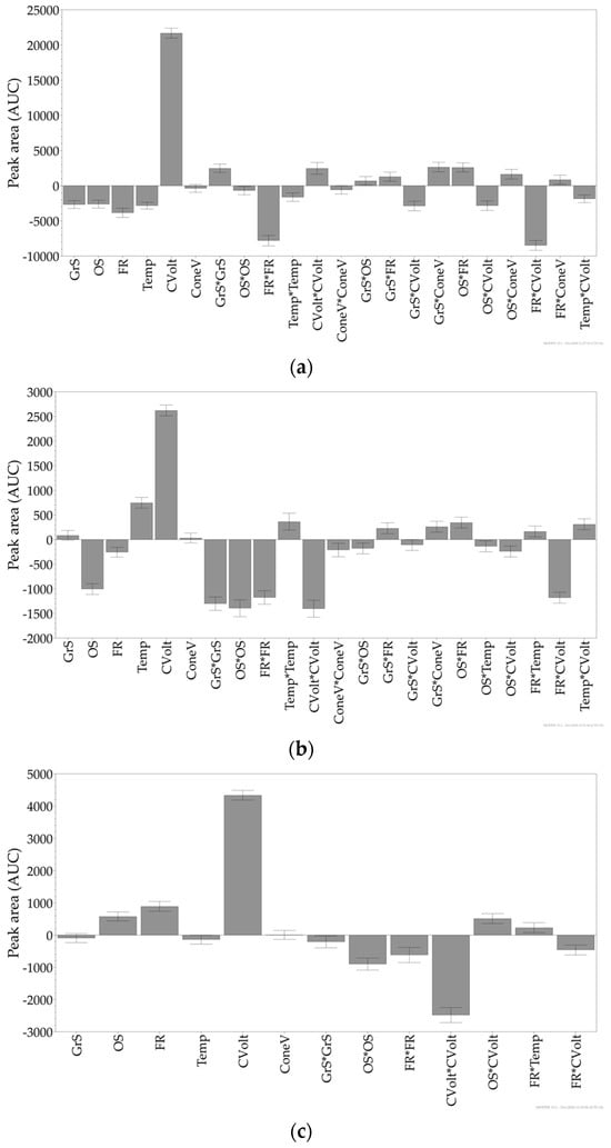 Coefficient charts from the central composite orthogonal design for the peak area of tazarotene (Area1) (a), tazarotenic acid (Area2) (b), and ketoconazole (Area3) (c). The x-axis represents the experimental factors as well as their interactions, while the y-axis represents the coefficient value, reflecting each factor’s effect on the response. The error bars indicate the 95% confidence interval, * represents multiplication sign. Abbreviations: GrS = gradient steepness; OS = amount of organic solvent; FR = flow rate; Temp = colum temperature; CVolt = capillary voltage; ConeV = cone voltage.