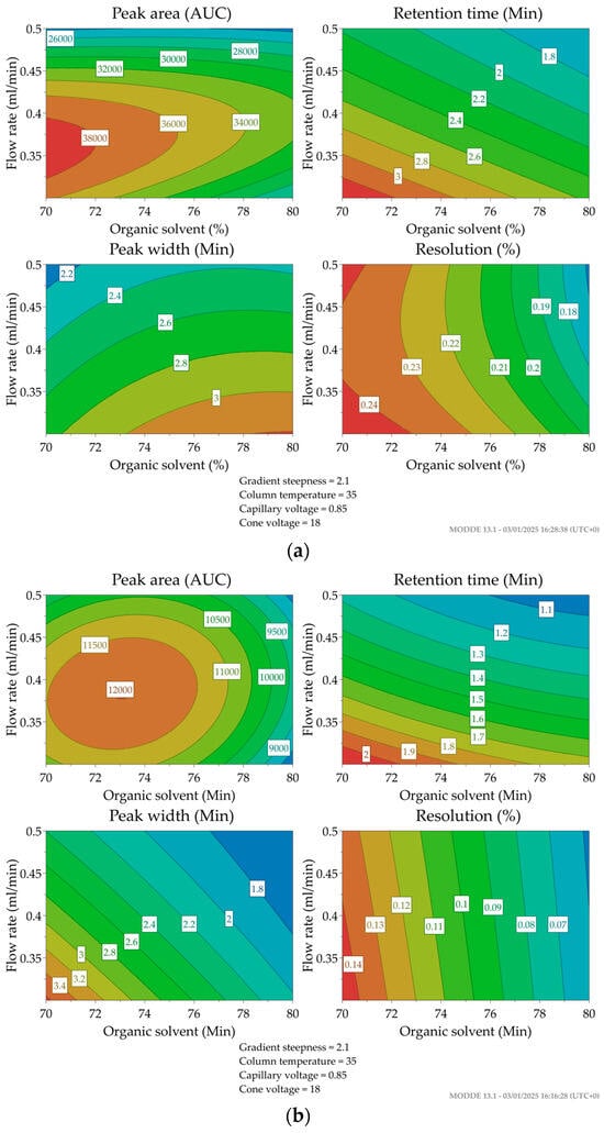 The results show that increasing the capillary voltage results in a larger peak area for all analytes. The amount of organic solvent, flow rate, gradient steepness, and column temperature all significantly negatively affected Area1, indicating that reducing these factors would result in a larger peak area of tazarotene (Figure 1a). For tazarotenic acid, on the other hand, column temperature positively affected the analyte’s peak area, while the amount of organic solvent and flow rate negatively affected it, just as with tazarotene (Figure 1b). When examining the effects that experimental factors had on tR1 and tR2, it was noted that the flow rate and the amount of organic solvent both had a significant negative effect. This indicates that reducing the flow rate and amount of organic solvent significantly increases the retention time of tazarotene and tazarotenic acid. The amount of organic solvent, gradient steepness, column temperature, and flow rate all significantly reduced Res1 and Res2. Additionally, a significant negative effect on Res1 was attributed to the capillary voltage.