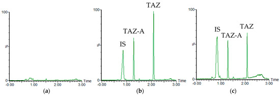 UPLC-QDa chromatograms of porcine skin samples. (a) blank; (b) skin sample with tazarotene (TAZ) and tazarotenic acid (TAZ-A) spiked with the IS; (c) blank spiked with tazarotene, tazarotenic acid, and the IS.