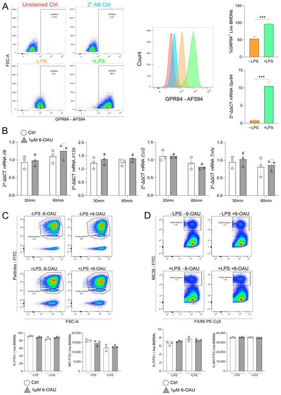 In murine BMDMs, LPS increased GPR84 expression, but 6-OAU did not enhance pro-inflammatory signaling or phagocytosis. (A) Flow cytometry of GPR84 surface and mRNA expression after LPS (100 ng/mL, 16 h) stimulation. Bar charts quantify expression. (B) mRNA expression of GPR84 targets after LPS (100 ng/mL, 16 h) and 6-OAU (1 µM, 30 or 60 min) stimulation. (C) Phagocytosis of opsonized beads after LPS (100 ng/mL, 16 h) and 6-OAU (1 µM, 60 min) treatment. (D) Phagocytosis of CD47-blocked MC38 cells after LPS (100 ng/mL, 16 h) and 6-OAU (1 µM, 60 min) treatment. Statistical analysis: (A) Student’s t-test; (B–D) one-way ANOVA and Tukey’s test, with *** p ≤ 0.001. n = 3.