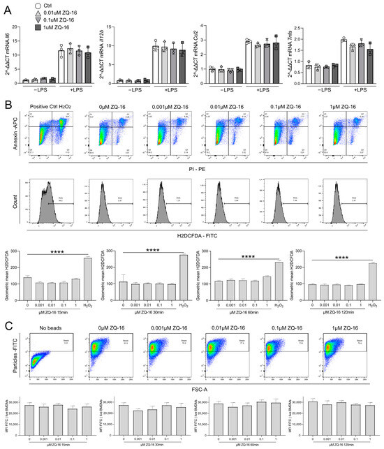 In murine BMDMs, ZQ-16 did not enhance pro-inflammatory cytokine expression, phagocytosis, or ROS production. (A) mRNA expression of GPR84 downstream molecules after LPS (100 ng/mL, 16 h) and ZQ-16 (0.01–1 µM, 60 min) stimulation. (B) ROS levels after LPS (100 ng/mL, 16 h) and ZQ-16 (0.01–1 µM, 60 min) treatment analyzed by flow cytometry. (C) Phagocytosis of opsonized beads after LPS (100 ng/mL, 16 h) and ZQ-16 (0.001–1 µM, 60 min) treatment. Statistical analysis: one-way ANOVA and Tukey’s test, with **** p ≤ 0.0001. n = 3.