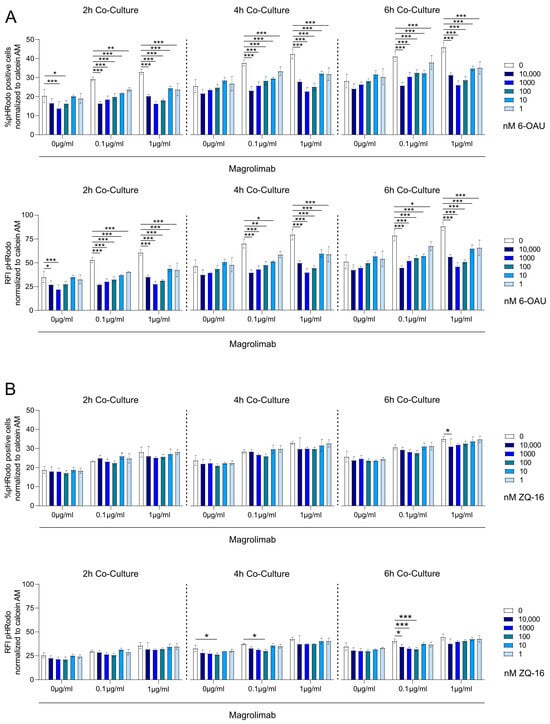 Previous publications reported that GPR84 activation promotes macrophage-mediated tumor cell phagocytosis [13]. To test the effect of 6-OAU and ZQ-16 on the efficacy of tumor cell phagocytosis, a further ADCP assay was performed. pHrodo Red-labeled human Raji cancer cells (target cells) were incubated with magrolimab (anti-CD47 antibody) and co-cultured with calcein AM-labeled J774 mouse macrophages which were pre-treated with LPS and stimulated with either 6-OAU or ZQ-16. LPS pre-incubation of macrophages significantly increased Raji cell phagocytosis in J774 cells, and the effect was enhanced by the addition of magrolimab (Supplementary Figure S8). However, both GPR84 agonists failed to increase the phagocytosis of Raji cells by means of J774 macrophages (Figure 4). Conversely, 6-OAU stimulation of J774 cells significantly decreased the phagocytosis of Raji cells (Figure 4A). In summary, the ADCP assay indicated that the GPR84 agonists 6-OAU and ZQ-16 did not increase macrophage-mediated tumor cell phagocytosis.
