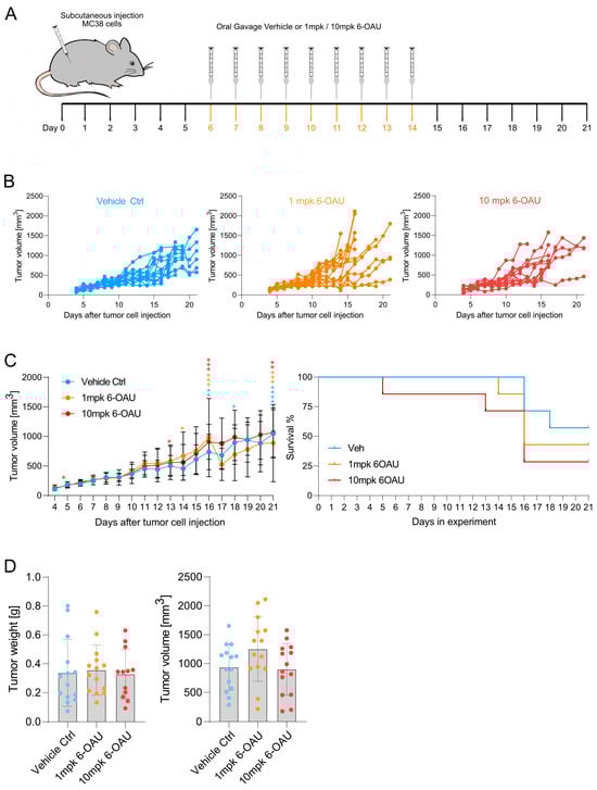 Oral 6-OAU administration showed no anti-cancer effects in the subcutaneous MC38 mouse model. C57BL/6 mice were injected with MC38 cells and treated with the vehicle or 6-OAU (1 or 10 mpk) via oral gavage. (A) The experimental design. (B) The tumor growth curve for each group. (C) Left: the average tumor growth and survival curve; right: the Kaplan–Meier curve. + indicates the removal of individual animals from experiments upon meeting termination criteria. (D) Tumor volume and weight at termination. Statistical analysis: (B,C) two-way ANOVA with Dunnett’s test; (D) one-way ANOVA with Tukey’s test.