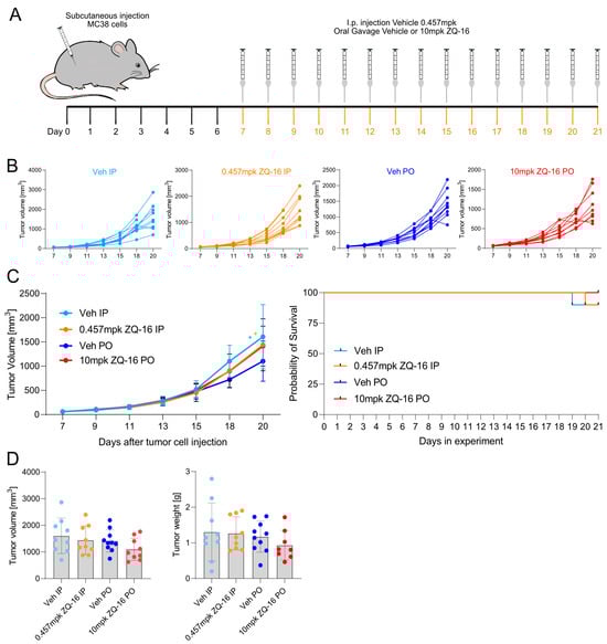 Oral and intraperitoneal ZQ-16 administration showed no anti-cancer effects in the subcutaneous MC38 mouse model. C57BL/6 mice were injected with MC38 cells and treated with the vehicle or ZQ-16 (0.457 mpk IP or 10 mpk PO). (A) The experimental design. (B) The tumor growth curve for each group. (C) Left: the average tumor growth and survival curve; right: the Kaplan–Meier curve. + indicates the removal of individual animals from experiments upon meeting termination criteria. (D) Tumor volume and weight at termination. Statistical analysis: (B,C) two-way ANOVA with Dunnett’s test; (D) one-way ANOVA with Tukey’s test.