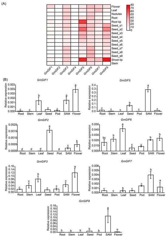 2.1. GmGIF5 Exhibits High Expression in the Shoot Tip