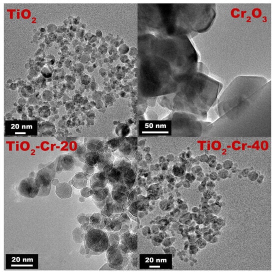 The particles of all TiO2-based materials are spherical in shape with a size mainly up to 20 nm, but there are also large ones, about 100 nm and higher. This represents normal distribution patterns with a small shoulder responsible for larger agglomerates (Figure 2). Each individual spherical particle is an agglomerate of smaller particles. The average particle size determined from TEM images is dTEM (TiO2) = 14 ± 7 nm, dTEM (TiO2-Cr-20) = 17 ± 9 nm, and dTEM (TiO2-Cr-40) = 13 ± 6 nm. It has been shown that the particles of TiO2 doped materials become less like spheres with increasing Cr(III) content, and we notice the appearance of clear lines, edges, and corners. The TEM images of pure Cr2O3 reveal particles of greater size around 100 nm and bigger, which grow larger compared to TiO2 as a result of interplay between nucleation, agglomeration, surface growth, and coalescence processes []. Pure Cr2O3 consists of hexagonal particles with angles of 120° (Figure 1).