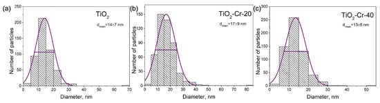Histograms of normal particle distribution for (a) TiO2, (b) TiO2-Cr-20, and (c) TiO2-Cr-40 materials.