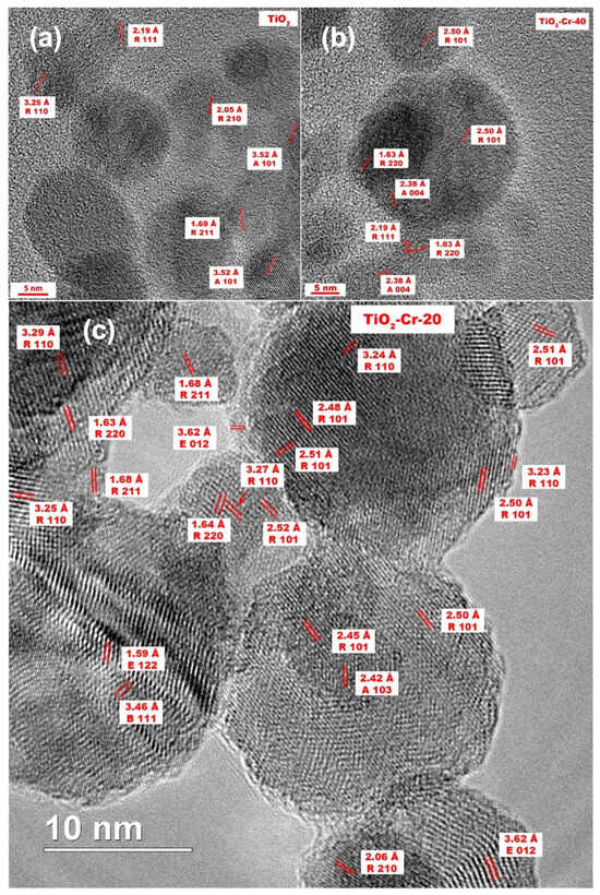 High-resolution TEM (HRTEM) images of (a) TiO2, (b) TiO2-Cr-40, and (c) TiO2-Cr-20 materials. A, R, and B in the white boxes are anatase, rutile, and brookite phases of TiO2 respectively, and E is the eskolaite phase of Cr2O3, the 3-digit number next to phase designation are the Miller indices, the row above is the interplane distance in Angstroms. Red parallel lines indicate the crystallographic planes.