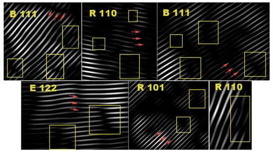 IFFT images of TiO2-Cr-20 phases. White lines are families of crystallographic planes, yellow frames indicate defects associated with the appearance of an extra half-plane or its absence, and red arrows indicate defects associated with shear as a result of doping. R, B are the rutile and brookite phases of TiO2, and E is the eskolaite phase of Cr2O3, numbers next to phase designations are Miller indices of crystallographic planes.