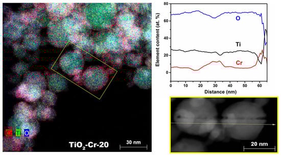 Chromium, titanium, and oxygen are fairly evenly distributed in the TiO2-Cr-20 material (Figure 5), which correlates with the features of the synthesis method. However, there are areas of increased Cr concentration, especially at the edges of the particles as can be seen from the mapping «along the line» in Figure 5. It is shown that within individual particles the modifier is distributed evenly; however, near the boundaries, jumps in content are observed, indicating the formation of a Cr2O3 impurity phase, which is especially clearly observed at the coordinates of 33 and 58 nm (Figure 5). The energy-dispersive X-ray study of doped materials confirms the uneven Cr distribution (see Figure S3). Chromium content in the middle of a randomly selected particle was lower than the specified value (7 at.%, with a given 20 at.%). Hereby, according to the obtained element maps, areas with an increased Cr content near the particle boundaries are observed, which is associated with the formation of Cr2O3 due to the limited solubility of Cr3+ in TiO2 phases, as well as the formation of Cr6+, whose too small ionic radius does not allow it to participate in the formation of substitutional solid solutions, ri = 0.44 Å [].
