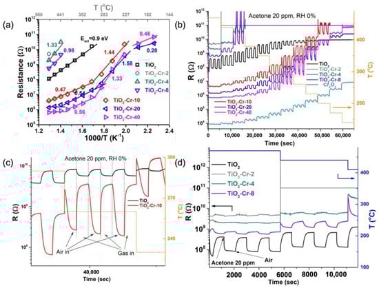 A composite nature of the obtained materials is manifested in the changes in their electrical resistance along with the increase in the Cr content in the synthesized samples. The dependences of electrical resistance on working temperature (T) for thick TiO2-based films deposited on Al2O3 substrates in the dry clean air media were obtained in the temperature range of 140–500 °C (Figure 7a).