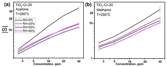 Concentration dependencies of the sensor signal of TiO2-Cr-20 material at different humidity values towards (a) acetone and (b) methanol. The modulus of sensor response is given for the sake of easier comparison, while all Cr-containing materials behave as p-type semiconductors, and pure TiO2 shows n-type behavior.