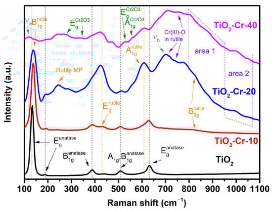 The spectrum of pure TiO2 contains the Raman modes characteristic for the anatase and rutile phases [,,,].