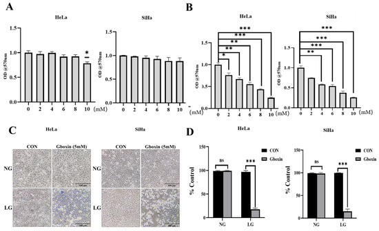Tumor cells are capable of proliferating in low-glucose environments by reprogramming their metabolic pathways, thereby facilitating survival despite nutrient limitations. This metabolic adaptation significantly influences their sensitivity to pharmacological interventions. To examine the anticancer function of Gboxin in cervical cancer cells, we treated HeLa cells and SiHa cells with different concentrations of Gboxin under different culture conditions. The results indicate that Gboxin concentrations below 10 mM did not significantly impact the viability of cervical cells under normal conditions, as assessed by the MTT assay (Figure 1A). However, they significantly inhibited the viability of cervical cancer cells under low-glucose conditions in a dose-dependent manner (Figure 1B).