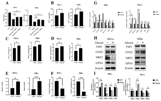 Excessive autophagy has been shown to facilitate ferroptosis [15]. Given that abnormalities in mitochondria are linked to ferroptosis, it is hypothesized that Gboxin may induce ferroptosis of cervival cancer cells. Initially, the cells were treated with the ferroptosis inhibitor Fer-1 to assess its potential protective effect against Gboxin-induced cell death. The findings demonstrate that Fer-1 effectively mitigated the cell death caused by Gboxin, as illustrated in Figure 3A. To further confirm this result, we subsequently assessed specific indicators associated with ferroptosis following Gboxin treatment under low-glucose culture conditions. The results show that Gboxin increased the levels of Fe2+, malondialdehyde (MDA), and lipid peroxide (LPO) in cervical cancer cells under low-glucose conditions (Figure 3B–D). Furthermore, the DCFH-DA probe was employed to assess the intracellular levels of reactive oxygen species (ROS) (Figure 3E). The findings indicate a significant increase in ROS levels following treatment with Gboxin. NADPH participates in redox reactions, and a high NADPH/NADP+ ratio is crucial for maintaining cellular redox potential, promoting effective reduction processes. Therefore, we next detected the changes in the NADP+/NADPH ratio in HeLa and SiHa cells, and the results show that the NADP+/NADPH ratio decreased significantly after Gboxin treatment (Figure 3F). The aforementioned results demonstrate that following Gboxin treatment, HeLa and SiHa cells exhibited an elevation in NADPH levels as a mechanism to counteract oxidative stress. However, despite this adaptive response, the cells ultimately struggled to withstand the oxidative damage induced by ROS, leading to ferroptosis.