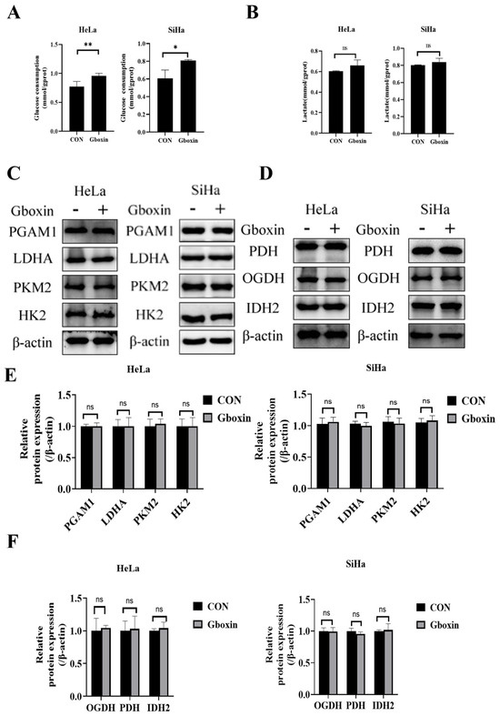 Gboxin did not influence glycolysis and the expression of rate-limiting enzymes within the TCA cycle. (A,B) The effects of Gboxin treatments on glucose consumption (A) and lactate secretion (B) of HeLa and SiHa cells under low-glucose conditions. (C–F) The expression of proteins in glycolysis (C) and TCA cycle (D) under low-glucose conditions was measured by Western blotting, and the results were quantified with Image J software version 1.54f (E,F). β-actin was used as a loading control. * p < 0.05; ** p < 0.01. ns, no significance.