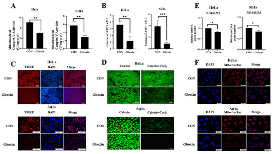 Gboxin treatment resulted in mitochondrial dysfunction under low-glucose conditions. (A) The effect of Gboxin on mitochondrial complex V activity in HeLa and SiHa cells under low-glucose conditions. (B) The effect of Gboxin on ATP levels in HeLa and SiHa cells under low-glucose conditions. (C) The effect of Gboxin on the mitochondrial membrane potential in HeLa (top) and SiHa (bottom) cells under low-glucose conditions was measured by the fluorescent probe TMRE. Top scale bar = 200 μm; bottom scale bar = 100 μm. (D) The effect of Gboxin on MPTP opening in HeLa (top) and SiHa (bottom) cells under low-glucose conditions was measured by Calcein AM staining. Top scale bar = 200 μm; bottom scale bar = 100 μm. (E) The effect of Gboxin on the mtDNA copy number in HeLa and SiHa cells under low-glucose conditions. (F) The effect of Gboxin on the mtDNA copy number in HeLa and SiHa cells under low-glucose conditions was measured by Mito tracker staining. Scale bar = 20 μm; * p < 0.05, ** p < 0.01, and *** p < 0.001.