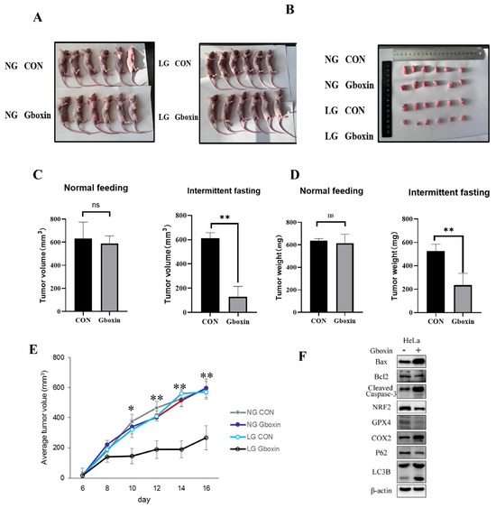 Gboxin inhibited tumor growth under nutrient deprivation conditions. (A) HeLa cells were injected subcutaneously into nude mice to evaluate tumor growth under normal feeding and intermittent fasting conditions. (B) Photographs of tumor-bearing mice (n = 6 per group). (C,D) The tumor volume (C) and weight (D) of each group were measured after the intra-peritoneal injection of Gboxin under normal feeding and intermittent fasting conditions. (E) The tumor growth curves in four groups with different treatments. (F) The expression of apoptosis-, autophagy-, and ferroptosis-related proteins in tumor tissues were measured by Western blotting (n = 6 per group). * p < 0.05 and ** p < 0.01; ns, no significance.