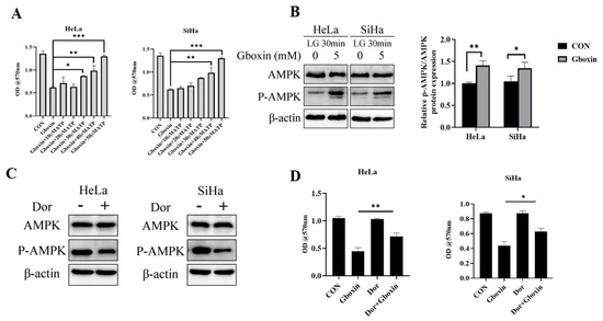 To further investigate whether the activation of AMPK mediated the anti-tumor effects of Gboxin, we used the AMPK inhibitor Dorsomorphin (Dor) to examine the role of AMPK in this process. The results show that Dor treatment significantly reduced the level of p-AMPK (Figure 7C) and markedly reversed the inhibitory effect of Gboxin on cervical cancer cells (Figure 7D). Altogether, these results indicate that Gboxin exerted an antitumor effect by activating the AMPK signaling pathway.