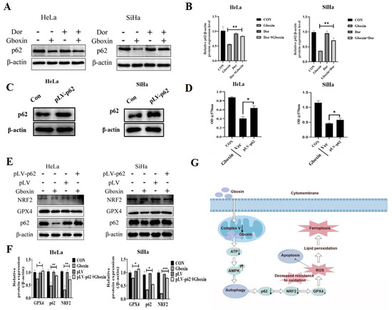 Based on the aforementioned results, we hypothesized that Gboxin enhanced AMPK-mediated autophagy, lowered cellular antioxidant activity, and triggered apoptosis and ferroptosis. Since Gboxin could significantly promote the degradation of p62 (Figure 2F), we next asked how increased autophagy affected the antioxidant activity of cells after Gboxin treatment. We observed that after adding Dor, the decrease in the level of autophagy-related protein p62 induced by Gboxin was reversed (Figure 8A,B). As p62 has the capacity to influence cellular antioxidant activity by disrupting the p62-Keap1-Nrf2 complex, we deduced that p62 played a crucial role in mediating the crosstalk between autophagy and Nrf2 activity. Therefore, we next detected whether Gboxin-induced cell death could be reversed by the overexpression of p62 protein. As shown in Figure 8C,D, the overexpression of the p62 protein successfully reversed the inhibitory effect of Gboxin on cervical cancer cells.