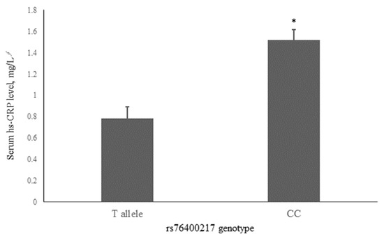 Associations of serum hs-CRP with the rs76400217 C>T. Mean ± standard error (SE) concentrations of hs-CRP for the T allele and CC genotypes are shown by gray bars. * p < 0.001 was derived using an independent t-test. ∮ Tested following logarithmic transformation. hs-CRP, high-sensitivity C-reactive protein.