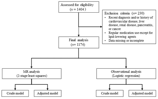 After applying exclusion criteria, which included recent diagnoses or histories of cardiovascular disease, liver disease, renal disease, pancreatitis, or cancer, regular use of medications (excluding lipid-lowering agents), and accounting for missing or incomplete data, 230 participants were excluded. The diseases were identified based on self-reports from the participants during their routine medical check-ups, using standardized hospital-provided questionnaires. As a result, 1174 participants, aged 22 to 86, were included in the final analysis. The detailed selection process is depicted in Figure 2.