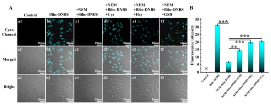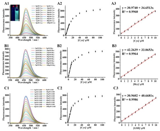 All the spectra detection processes were carried out in acetonitrile/PBS (v/v = 2/8, pH = 7.4). The fluorescence spectra of Bibc-DNBS treated with a series of biothiols (0.0–100.0 μM) were measured in Figure 1. The probe Bibc-DNBS (10.0 μM) had weak fluorescence emission. With the addition of biothiols, the fluorescence intensity at 462 nm increased about 26/24/23-fold for Cys/Hcy/GSH (Figure 1A1,A2,B1,B2,C1,C2), correspondingly. There was a well-defined linear relationship between the intensity enhancement and the concentration of biothiols (LOD of 0.042/0.092/0.121 μM for Cys/Hcy/GSH) (Figure 1A3,B3,C3). In contrast, there were no obvious changes in the emission spectra of Bibc-DNBS upon introduction of possible competing essential amino acids (Phenylalanine (Phe), Alanine (Ala), Tryptophan (Trp), Histidin (His), Lysine (Lys), Proline (Pro), Methionine (Met), Arginine (Arg), Aspartic acid (Asp), Glutamic acid (Glu), Threonine (Thr), Valine (Val), Isoleucine (Ile)), several ions (Mn2+, Na+, Mg2+, AcO−, NO2−, SO32−, and PO43−), and other analytes (glucose and citric acid). Moreover, the sensing ability of Bibc-DNBS to biothiols was assessed in the presence of other interfering substances. As illustrated in Figure S1, there was no remarkable influence on recognizing biothiols in aqueous solutions. The stable behavior of Bibc-DNBS and satisfactory fluorescence response at pH values between 6 and 8 (Figure S2) and at temperatures between 32–40 °C (Figure S3) ensured the feasibility of the physiological state for biothiol detection. Meanwhile, it was found that the fluorescence intensity increased continuously and reached saturation within 300 s upon addition of Cys, Hcy, or GSH, respectively (Figure S4), and maintained a stable fluorescence turn-on for the subsequent 8 h (Figure S5). All these phenomena showed that Bibc-DNBS could be used as an efficacious candidate for real-time sensing of biothiols.