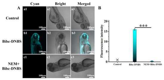 (A) Imaging experiments for detection of thiols in zebrafish. (a1–a3) Control: zebrafish not incubated with the probe Bibc-DNBS. (b1–b3) Zebrafish was incubated with Bibc-DNBS (10.0 μM) for 30 min. (c1–c3) Zebrafish was pretreated with NEM (1.0 mM) for 30 min, then incubated with probe Bibc-DNBS (10.0 μM) for another 30 min. (B) Fluorescence intensities in panels (a–c). n = 3; error bars are ±SD. Statistical analysis was performed with a one-way ANOVA. Among them, *** p < 0.001. Scale bar 100 μm.
