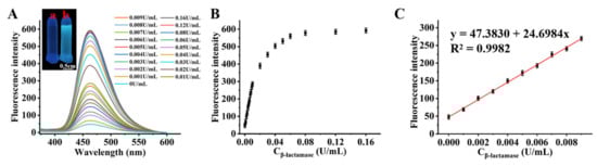 (A) Fluorescence spectra of Bibc-DNBS upon addition of different concentrations of β-lactamase (0–0.16 U/mL) containing 250.0 μM cefazolin sodium. Inset: cuvette image of probe Bibc-DNBS before (a) and after reaction (b) with β-lactamase taken under a handheld UV lamp (λex = 365 nm), scale bar 0.5 cm. (B) With the concentration of β-lactamase being (0.0–0.16 U/mL), the fluorescence signal intensity scattering diagram of Bibc-DNBS (10.0 μM) at 462 nm. (C) Linear diagram of fluorescence signal intensity of probe and β-lactamase (0.000–0.010 U/mL).