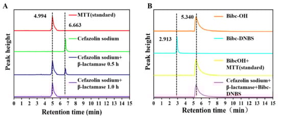 (A) HPLC chromatogram of the reaction of cefazolin sodium with β-lactamase: (red) MMT standard, (green) cefazolin sodium, (blue) cefazolin sodium reacted with beta-lactamase for 0.5 h, and (purple) cefazolin sodium reacted with beta-lactamase for 1 h. (B) HPLC chromatogram of Bibc-DNBS reacting with β-lactamase: (orange) Bibc-OH, (cyan) Bibc-DNBS, (yellow) Bibc-DNBS reacted with MMT standard, and (pink) cefazolin sodium reacted with β-lactamase and Bibc-DNBS. Conditions: eluent H2O/CH3CN (v/v, 90/10); flow rate 1.0 mL/min; temperature 30 °C; sample injection volume 20.0 μL.