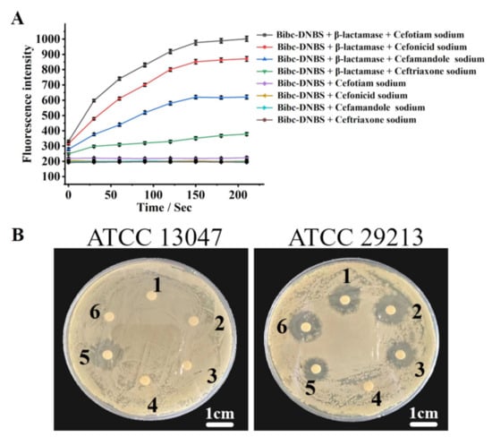 (A) The fluorescence intensity of Bibc-DNBS with or without β-lactamase was recorded by enzyme-labeling instrument when different antibiotics were used as substrates. (B) Inhibition circle test (1–6 cefazolin sodium, cefotiam sodium, cefonicid sodium, blank reagents, ceftriaxone sodium, and cefamandole sodium); scale bar 1 cm.
