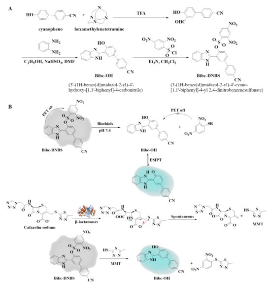 (A) Synthetic route to Bibc-DNBS. (B) Mechanism of thiol recognition and the indirect detection of β-lactamase by Bibc-DNBS.