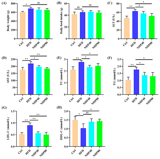 NHP mitigates obesity development in HFD rats. (A) Body weight at 12 weeks post-NHP treatment. (B) Daily food consumption. Serum parameters include (C) ALT, (D) AST, (E) TC, (F) TG, (G) LDL-C, and (H) HDL-C. Data are presented as mean ± SD (n = 3. * Indicates significance, * p < 0.05, ** p < 0.01, ns: no significant difference).